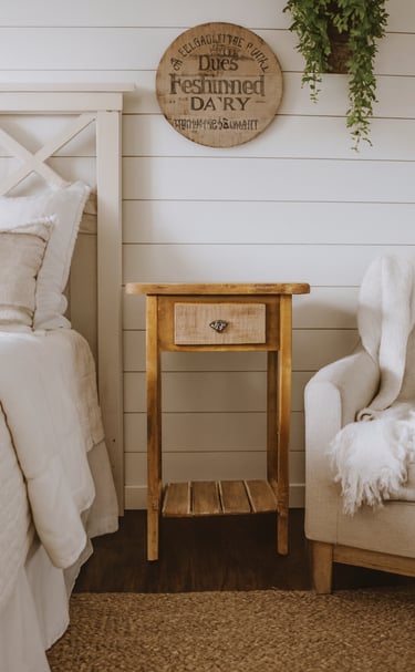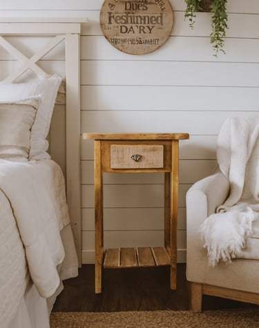 No farmhouse, a madeira nunca é coadjuvante. Ela aparece com naturalidade — seja na cabeceira da cama, nos criados-mudos, nas molduras ou até em pequenas bandejas decorativas.