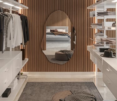 Para complementar as placas ripado, o espelho decorativo orgânico lapidado agrega valor visual e funcional ao espaço. Este tipo de espelho não é apenas um item prático para o dia a dia, mas também um elemento de design que pode ampliar a percepção de espaço e luminosidade. Sua forma orgânica e acabamento lapidado dão um toque sofisticado ao quarto, harmonizando-se com as texturas criadas pelas placas MDF. Juntos, esses elementos têm o potencial de transformar completamente a atmosfera do ambiente, promovendo uma sensação de elegância e bem-estar.